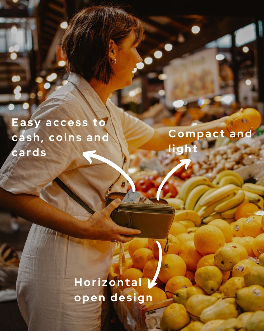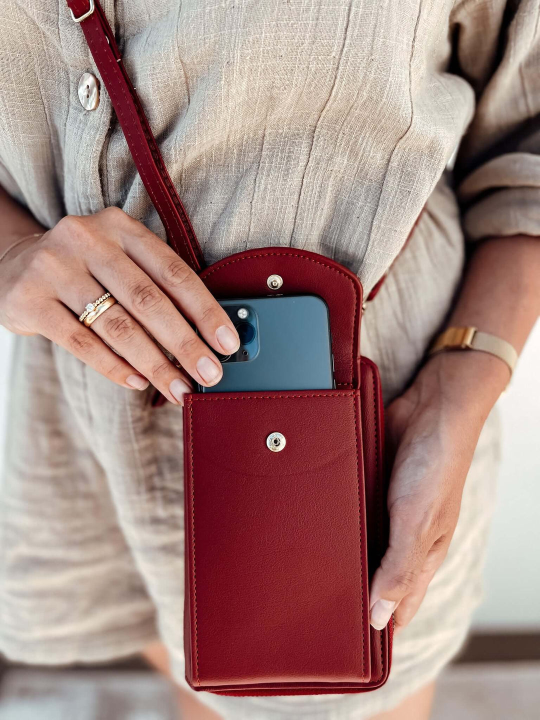 It has room for your cards, cash, glasses, keys, passport and much more. It also has an external pocket with a convenient push-button, to safely store your mobile phone.